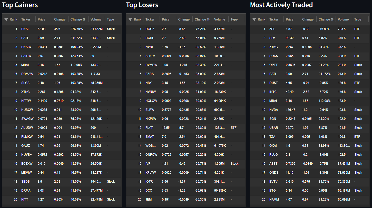 See the Top Gainers, Top Losers, and Most Actively Traded Tickers updated at the end of each trading day.