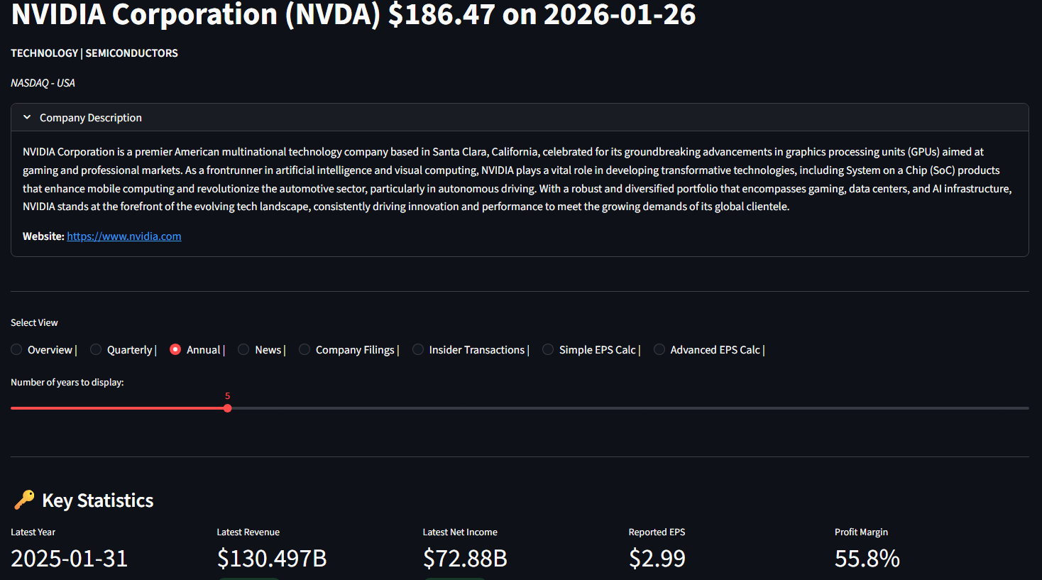 NVDA Overview Page (TOP), all companies have a brief description in the stock explorer.